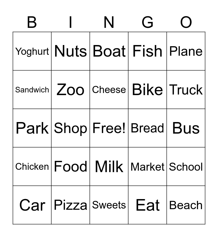 This bingo card has a free space and 24 words: Food, Pizza, Cheese, Car, Plane, Yoghurt, Sandwich, Nuts, Bread, Milk, Bike, Park, Market, School, Zoo, Eat, Bus, Boat, Truck, Shop, Beach, Chicken, Fish and Sweets.