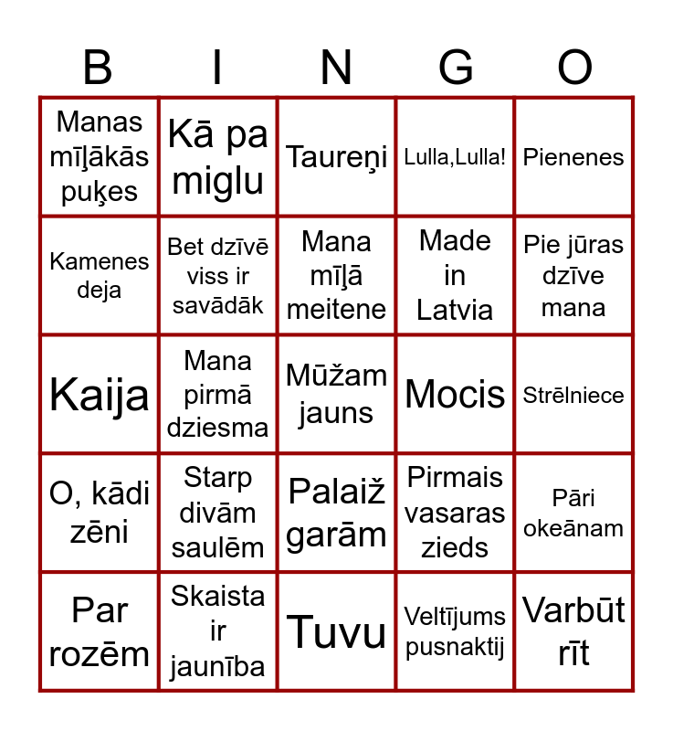 This bingo card has 72 words: Amālijas pažarnieks, Kā pa miglu, Mana pirmā dziesma, Tā diena, Kurpniekzeļļi, Sirdij nevajag skaitu, Lulla,Lulla!, Tomēr japadomā, Made in Latvia, Tu būsi vēl, Par rozēm, Vālodzīte, Pie jūras dzīve mana, Manas mīļākās puķes, Princesīte, Kaija, Pirmais vasaras zieds, Pienenes, Zemenes, Strēlniece, Starp divām saulēm, Mūžam jauns, Pāri okeānam, Vysskaistuokajai meitinai, Tu, mans mazais čipendeils, Viss ir iespējams, Laime šī, Tuvumā Tālumā, Septītās debesis, Mantra, Skaista ir jaunība, Mazs cinītis, Zaigžņu kabarē, Sauc palīgā, Veltījums pusnaktij, Spārni, Rudacīte, Vīrietis labākos gados, Kamenes deja, Mana sirds ir brīva, Palaiž garām, Varbūt rīt, 7 dienas, Dzintara krellītes, Neļķu ugunīs, O, kādi zēni, Mīļais nesteidzies, Pieņem mani kāda esmu, Kad klētiņā dusēsi, Sekundes, Pusnakts stundā, Figaro, Jauna ēra, Mocis, Rudens, Ar mani atkal runā kaijas, Taureņi, Mana mīļā meitene, Zīlīte, Rēdereja, Nāk nakts, Disko, Himalaji, Tuvu, Viena zvaigzne, Pēc lietus, Bet dzīvē viss ir savādāk, Dziesma par laimi, Tālu prom, Kurtizāņu ugunskurs, Balle Baložos and Brāl ar dzīvi nekaulē.
