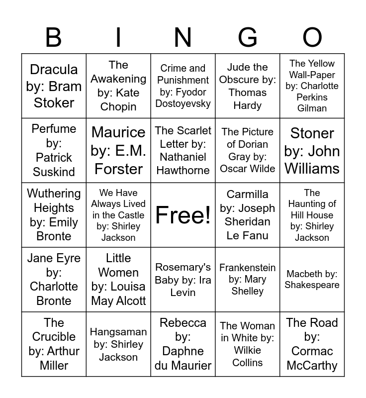 This bingo card has a free space and 24 words: Little Women by: Louisa May Alcott, Hangsaman by: Shirley Jackson, The Scarlet Letter by: Nathaniel Hawthorne, The Crucible by: Arthur Miller, The Yellow Wall-Paper by: Charlotte Perkins Gilman, Dracula by: Bram Stoker, Perfume by: Patrick Suskind, The Awakening by: Kate Chopin, Carmilla by: Joseph Sheridan Le Fanu, Rosemary's Baby by: Ira Levin, The Picture of Dorian Gray by: Oscar Wilde, Wuthering Heights by: Emily Bronte, Frankenstein by: Mary Shelley, Macbeth by: Shakespeare, Maurice by: E.M. Forster, The Woman in White by: Wilkie Collins, The Haunting of Hill House by: Shirley Jackson, Crime and Punishment by: Fyodor Dostoyevsky, Stoner by: John Williams, We Have Always Lived in the Castle by: Shirley Jackson, The Road by: Cormac McCarthy, Jane Eyre by: Charlotte Bronte, Jude the Obscure by: Thomas Hardy and Rebecca by: Daphne du Maurier.