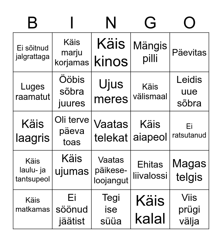 This bingo card has a free space and 24 words: Käis ujumas, Ei söönud jäätist, Ujus meres, Käis matkamas, Päevitas, Ei sõitnud jalgrattaga, Luges raamatut, Käis marju korjamas, Käis aiapeol, Vaatas päikese-loojangut, Käis välismaal, Käis laagris, Ehitas liivalossi, Magas telgis, Ööbis sõbra juures, Käis kalal, Ei ratsutanud, Käis kinos, Leidis uue sõbra, Oli terve päeva toas, Viis prügi välja, Käis laulu- ja tantsupeol, Mängis pilli and Tegi ise süüa.