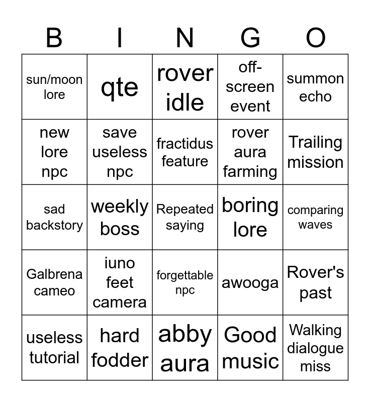 This bingo card has a free space and 24 words: iuno feet camera, hard fodder, fractidus feature, useless tutorial, summon echo, sun/moon lore, new lore npc, qte, boring lore, forgettable npc, rover aura farming, sad backstory, awooga, Rover's past, save useless npc, Good music, comparing waves, rover idle, Trailing mission, weekly boss, Walking dialogue miss, Galbrena cameo, off-screen event and abby aura.