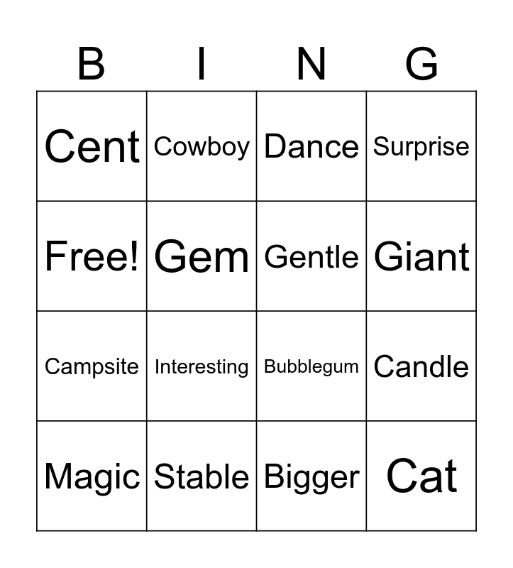 This bingo card has 16 words: Stable, Candle, Dance, Cent, Campsite, Cowboy, Bubblegum, Bigger, Free!, Gem, Magic, Surprise, Interesting, Giant, Gentle and Cat.