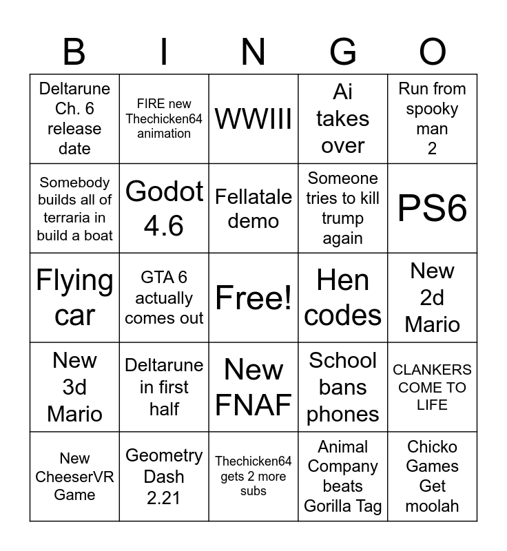 This bingo card has a free space and 24 words: Deltarune in first half, Geometry Dash 2.21, Fellatale demo, New CheeserVR Game, Run from spooky man 2, Deltarune Ch. 6 release date, Somebody builds all of terraria in build a boat, FIRE new Thechicken64 animation, Hen codes, New FNAF, Someone tries to kill trump again, Flying car, School bans phones, CLANKERS COME TO LIFE, Godot 4.6, Animal Company beats Gorilla Tag, New 2d Mario, WWIII, PS6, GTA 6 actually comes out, Chicko Games Get moolah, New 3d Mario, Ai takes over and Thechicken64 gets 2 more subs.
