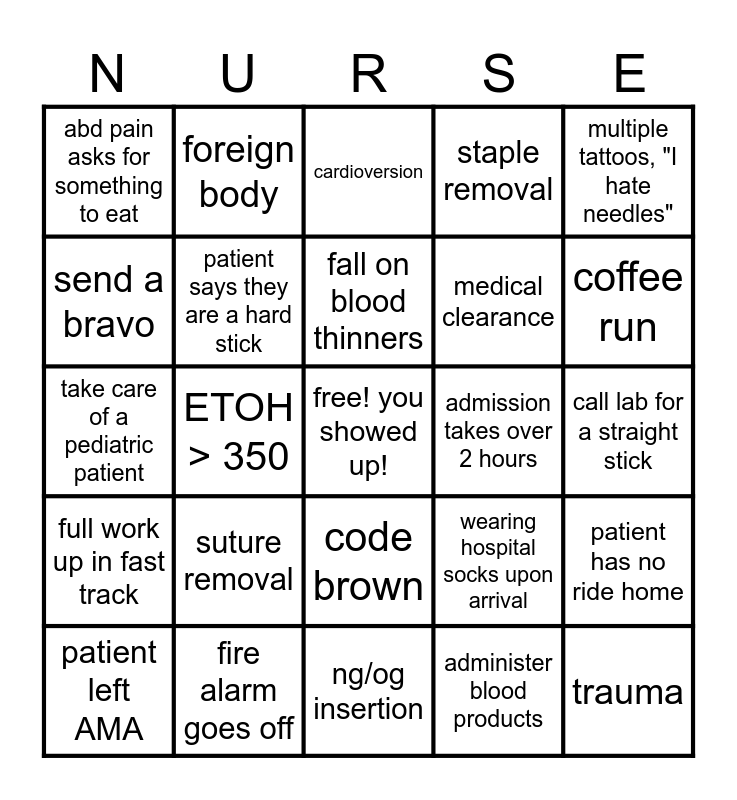 This bingo card has a free space and 34 words: code blue, perform visual acuity test, frequent flyer, insert a foley/straight cath, call lab for a straight stick, send a bravo, patient says they are a hard stick, ng/og insertion, medical clearance, trauma, take care of a pediatric patient, foreign body, administer blood products, need doctors note, full work up in fast track, ETOH > 350, code brown, admission takes over 2 hours, patient has no ride home, patient left AMA, fire alarm goes off, rapid response, staple removal, coffee run, give a patient a turkey sandwich, suture removal, cardioversion, 2 for 1 patient in a single room, multiple tattoos, "I hate needles", abd pain asks for something to eat, legal draw, fall on blood thinners, wearing hospital socks upon arrival and SI patient.