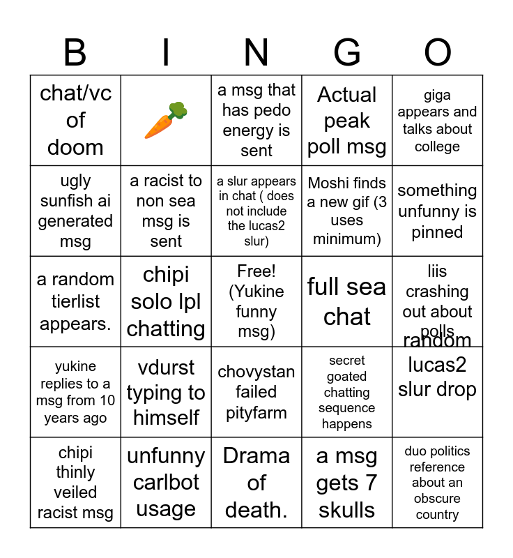 This bingo card has a free space and 29 words: chipi thinly veiled racist msg, liis whining about dating, chipi solo lpl chatting, miya or pony of albania appear, chat/vc of doom, a msg that has pedo energy is sent, a racist to non sea msg is sent, vdurst typing to himself, full sea chat, unfunny carlbot usage, liis crashing out about polls, duo politics reference about an obscure country, Drama of death., a msg gets 7 skulls, something unfunny is pinned, duo yapping about lcp to air, chovystan failed pityfarm, yukine replies to a msg from 10 years ago, giga appears and talks about college, a random tierlist appears., secret goated chatting sequence happens, Random argument goes on for an hour for no reason, Moshi finds a new gif (3 uses minimum), ugly sunfish ai generated msg, Actual peak poll msg, 🥕, random lucas2 slur drop, a slur appears in chat ( does not include the lucas2 slur) and 3 diff convos happening at the same time.