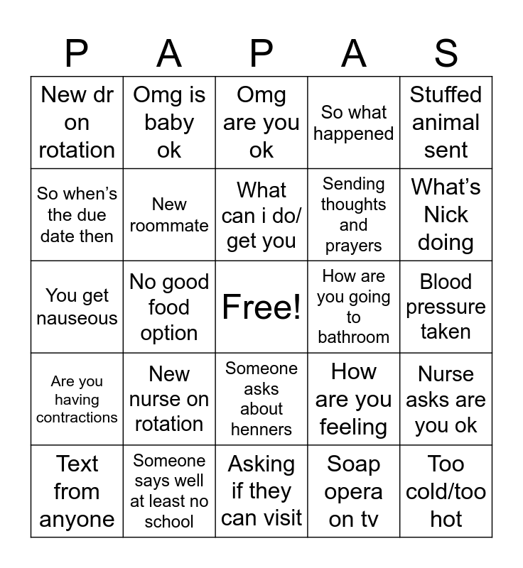 This bingo card has a free space and 27 words: How are you feeling, Sending good, Sending thoughts and prayers, Asking if they can visit, So when’s the due date then, Omg are you ok, Omg is baby ok, Are you having contractions, How are you going to bathroom, Nurse asks are you ok, You get nauseous, So what happened, Text from anyone, Someone says well at least no school, What’s Nick doing, Thats crazy, New roommate, What can i do/ get you, New nurse on rotation, New dr on rotation, Blood pressure taken, Soap opera on tv, No good food option, Too cold/too hot, Someone asks about henners, Stuffed animal sent and Food sent.