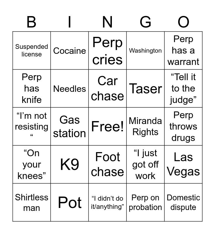 This bingo card has a free space and 24 words: K9, Pot, Car chase, Shirtless man, Perp has a warrant, Suspended license, Perp has knife, Cocaine, Miranda Rights, Foot chase, Taser, “I’m not resisting “, “I just got off work, Las Vegas, Needles, Perp on probation, Perp throws drugs, Perp cries, “Tell it to the judge”, Gas station, Domestic dispute, “On your knees”, Washington and “I didn’t do it/anything”.