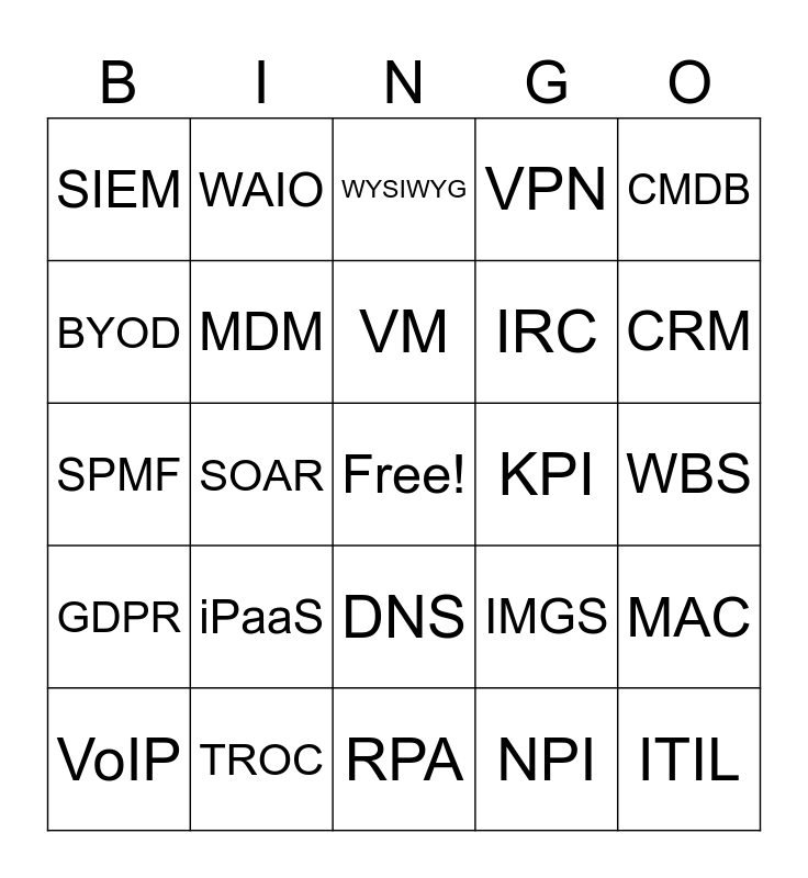 This bingo card has a free space and 37 words: API, DHCP, IoT, MDM, MAC, iPaaS, VM, VLAN, CMDB, AES, SOAR, VPN, ITIL, WBS, BYOD, GDPR, SLA, WYSIWYG, DNS, KPI, SIEM, CRM, VoIP, RPA, DPIA, NPI, WAIO, TSA, TTO, TOP, OCET, TROC, SPMF, IRA, IMGS, IRC and FHN.
