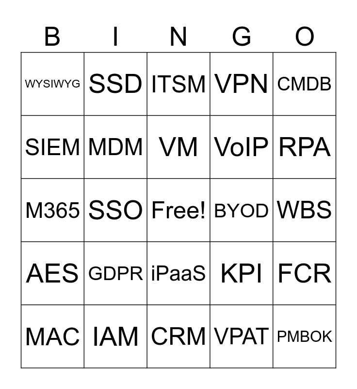 This bingo card has a free space and 39 words: API, DHCP, IoT, MDM, MAC, iPaaS, VM, VLAN, CMDB, AES, SSO, VPN, PMBOK, WBS, BYOD, GDPR, SLA, WYSIWYG, DNS, KPI, SIEM, CRM, VoIP, RPA, SQL, EOL, SSH, LMS, OLED, SSD, HDMI, AR, ITSM, IAM, VPAT, CSAT, FCR, M365 and MVP.