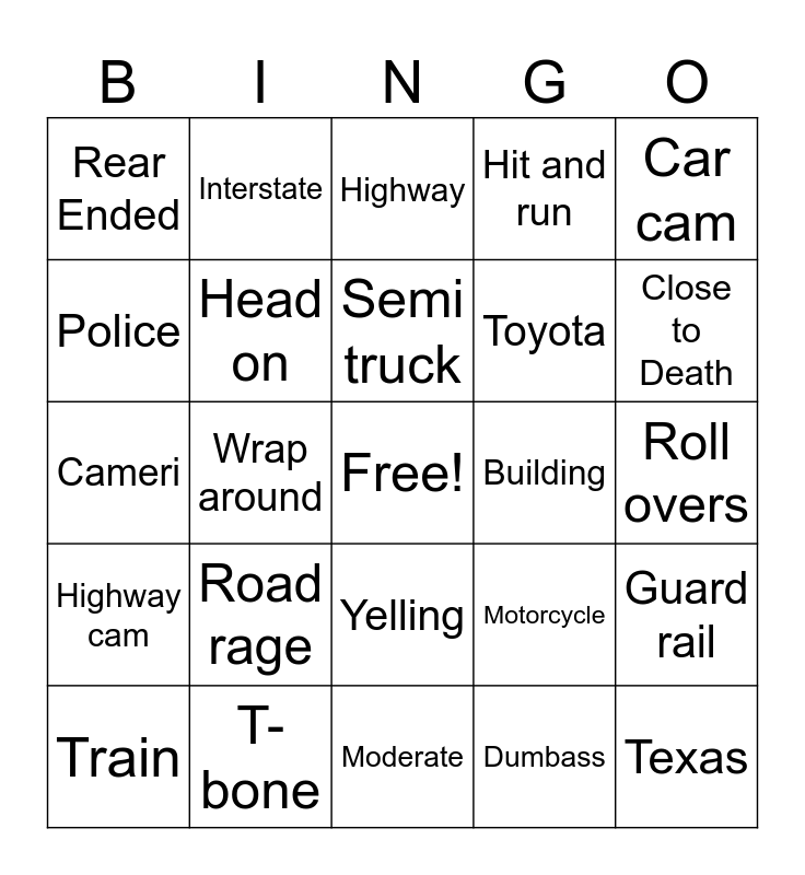 This bingo card has a free space and 24 words: Road rage, T-bone, Semi truck, Train, Car cam, Rear Ended, Police, Interstate, Building, Yelling, Toyota, Cameri, Motorcycle, Guard rail, Head on, Dumbass, Roll overs, Highway, Close to Death, Wrap around, Texas, Highway cam, Hit and run and Moderate.