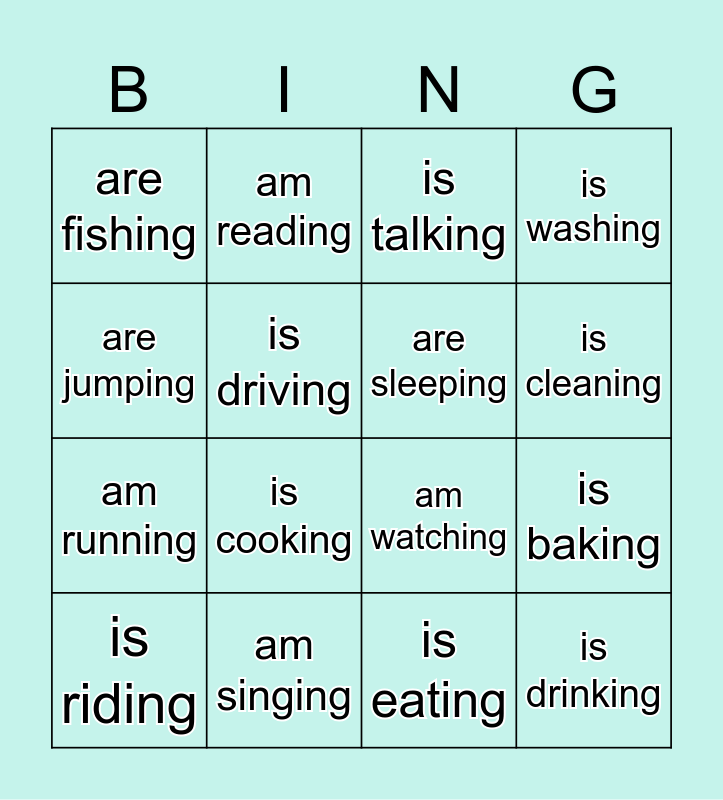 This bingo card has 20 words: is baking, are playing, is talking, is making, is riding, are jumping, am singing, are fishing, am running, am reading, is cooking, am watching, is driving, is drinking, are sleeping, is doing, is cleaning, is washing, is eating and is writing.