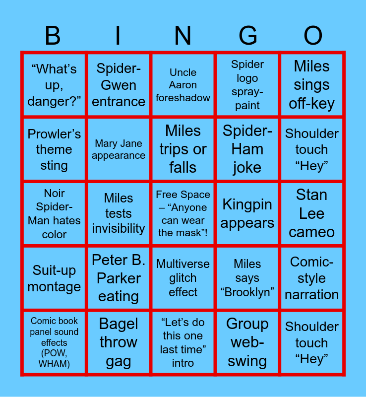 This bingo card has a free space and 24 words: Peter B. Parker eating, Bagel throw gag, Miles trips or falls, Comic book panel sound effects (POW, WHAM), Miles sings off-key, “What’s up, danger?”, Prowler’s theme sting, Spider-Gwen entrance, Kingpin appears, Multiverse glitch effect, Spider-Ham joke, Noir Spider-Man hates color, Miles says “Brooklyn”, Comic-style narration, Mary Jane appearance, Group web-swing, Stan Lee cameo, Uncle Aaron foreshadow, Shoulder touch “Hey”, Miles tests invisibility, Shoulder touch “Hey”, Suit-up montage, Spider logo spray-paint and “Let’s do this one last time” intro.