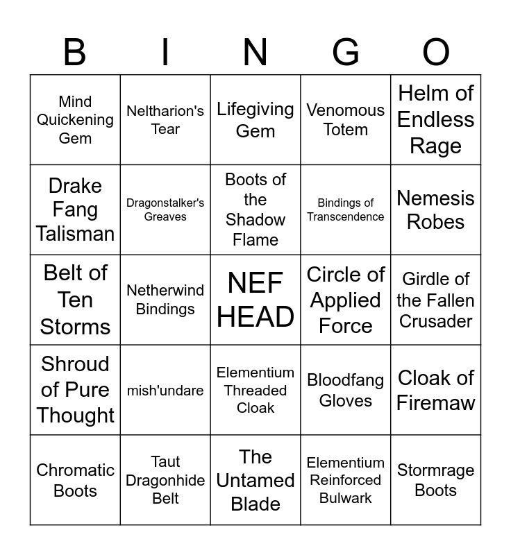 This bingo card has a free space and 24 words: mish'undare, Taut Dragonhide Belt, Boots of the Shadow Flame, Chromatic Boots, Helm of Endless Rage, Mind Quickening Gem, Drake Fang Talisman, Neltharion's Tear, Circle of Applied Force, Elementium Threaded Cloak, Bindings of Transcendence, Belt of Ten Storms, Bloodfang Gloves, Cloak of Firemaw, Dragonstalker's Greaves, Elementium Reinforced Bulwark, Girdle of the Fallen Crusader, Lifegiving Gem, Nemesis Robes, Netherwind Bindings, Stormrage Boots, Shroud of Pure Thought, Venomous Totem and The Untamed Blade.