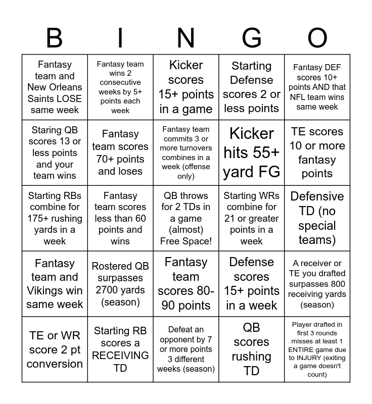 This bingo card has a free space and 24 words: Rostered QB surpasses 2700 yards (season), Starting RB scores a RECEIVING TD, Fantasy team commits 3 or more turnovers combines in a week (offense only), TE or WR score 2 pt conversion, Fantasy DEF scores 10+ points AND that NFL team wins same week, Fantasy team and New Orleans Saints LOSE same week, Staring QB scores 13 or less points and your team wins, Fantasy team wins 2 consecutive weeks by 5+ points each week, Starting WRs combine for 21 or greater points in a week, Fantasy team scores 80-90 points, Kicker hits 55+ yard FG, Starting RBs combine for 175+ rushing yards in a week, Defense scores 15+ points in a week, A receiver or TE you drafted surpasses 800 receiving yards (season), Fantasy team scores 70+ points and loses, QB scores rushing TD, Defensive TD (no special teams), Kicker scores 15+ points in a game, TE scores 10 or more fantasy points, Fantasy team scores less than 60 points and wins, Player drafted in first 3 rounds misses at least 1 ENTIRE game due to INJURY (exiting a game doesn't count), Fantasy team and Vikings win same week, Starting Defense scores 2 or less points and Defeat an opponent by 7 or more points 3 different weeks (season).