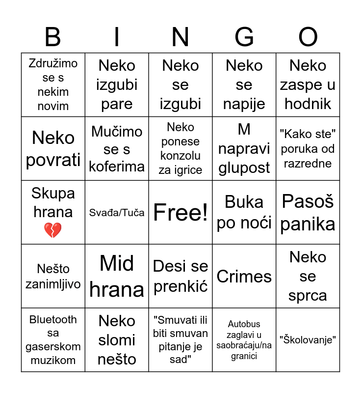 This bingo card has a free space and 24 words: Mid hrana, Neko slomi nešto, Neko ponese konzolu za igrice, Bluetooth sa gaserskom muzikom, Neko zaspe u hodnik, Združimo se s nekim novim, Neko povrati, Neko izgubi pare, Buka po noći, Desi se prenkić, M napravi glupost, Skupa hrana💔, Crimes, Neko se sprca, Mučimo se s koferima, Autobus zaglavi u saobraćaju/na granici, Pasoš panika, Neko se izgubi, "Kako ste" poruka od razredne, Svađa/Tuča, "Školovanje", Nešto zanimljivo, Neko se napije and "Smuvati ili biti smuvan pitanje je sad".