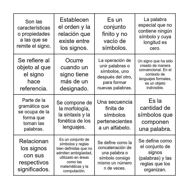 This bingo card has 23 words: Se define como el conjunto de signos (palabras) y las reglas que los organizan., Es un concepto abstracto que permite hacer referencia a objetos., Un signo que ha sido creado de manera convencional. En el contexto de lenguajes formales, es un objeto indivisible., Es el proceso mediante el cual se toma un objeto como un signo de algo., Se refiere al objeto al que el signo hace referencia., Son las características o propiedades a las que se remite el signo., Ocurre cuando un signo tiene más de un designado., Establecen el orden y la relación que existe entre los signos., Relacionan los signos con sus respectivos significados., Vinculan los signos directamente con sus usuarios., Se compone de la morfología, la sintaxis y la fonética de los lenguajes., Parte de la gramática que se ocupa de la forma que toman las palabras., Se ocupa de la expresión oral de las palabras., Es el lenguaje que utilizan los seres humanos para comunicarse en la vida cotidiana, caracterizado por su ambigüedad y flexibilidad., Es un conjunto de símbolos y reglas bien definidas que no admiten ambigüedad, utilizado en áreas como las matemáticas y la computación., Se refiere al estudio de los lenguajes utilizando herramientas y conceptos matemáticos., Es un conjunto finito y no vacío de símbolos., Una secuencia finita de símbolos pertenecientes a un alfabeto., La operación de unir palabras o símbolos, uno después del otro, para formar nuevas palabras., Es la cantidad de símbolos que componen una palabra., La palabra especial que no contiene ningún símbolo y cuya longitud es cero., Se define como la concatenación de una palabra o símbolo consigo mismo un número n de veces. and Una palabra que se lee igual de izquierda a derecha que de derecha a izquierda; es decir, es igual a su refleja..