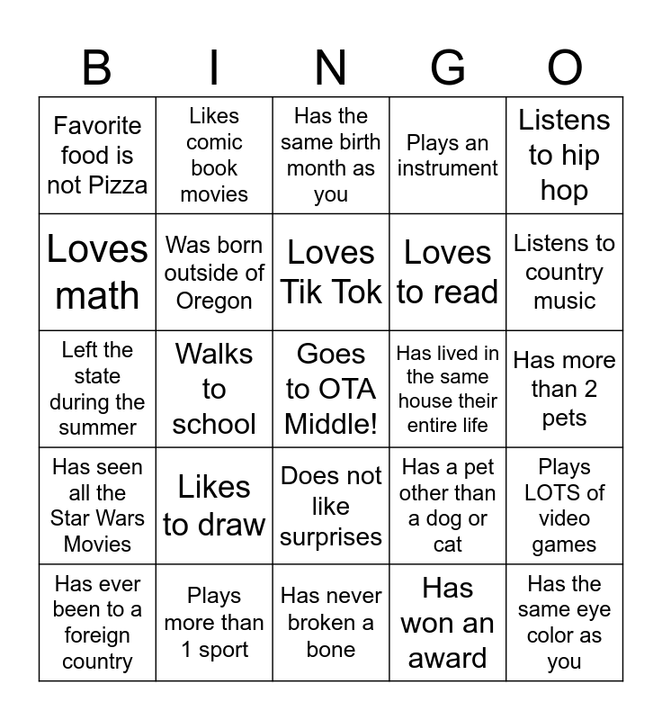 This bingo card has a free space and 29 words: Has ever been to a foreign country, Has thrown-up at school, Walks to school, Has more than 2 siblings, Favorite food is not Pizza, Has the same birth month as you, Was born outside of Oregon, Likes to draw, Has lived in the same house their entire life, Plays more than 1 sport, Has more than 2 pets, Has the same eye color as you, Has never broken a bone, Has won an award, Listens to country music, Loves to dance, Does not like surprises, Has seen all the Star Wars Movies, Listens to hip hop, Left the state during the summer, Has a pet other than a dog or cat, Has tried sushi, Loves to read, Loves math, Plays an instrument, Likes comic book movies, Plays LOTS of video games, Loves Tik Tok and Has used power tools.