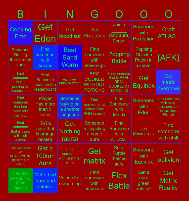 This bingo card has 49 words: Someone with Equinox, Popping Oblivion Potion in a server, Flex Battle, Player Has more than 5 ruins, "OMG I GOT DREAMMETRIC", Find Someone with really really rare aura in less than 10k rolls, Get Eden, Voice chat screaming, Someone with Pixelation, Someone misspeling a name aura, Craft ATLAS_, Get Pixelation, Get Equinox, Find a person that is REAL REAL COOKED AT 1M ROLLS, Get a 100m+ Aura, Someone with Éden, Someone Rolling their dream aura, [AFK], Get oblivion, Join a ______ (any aura) Server, Popping Battle, Someone saying on a another language, Cooking Emo, Find someone with Arcane, LES GO GAMBLING! (Free Space), Beat Sand Worm, Get matrix overdrive, Get a bad aura and delete it, BRO COOKED WITHOUT POTIONS, Find Someone thats on the leaderboard, Get Matrix Reality, Find Someone with Matrix, Find someone with MEGAPHONE (ig whats its called), Find someone with Summer Aura, Find someone that has more rolls than you, Find Someone with ATLAS_, Get Dreammetric, Find someone with chill, Find someone that is praying for dreamscape, Get Nothing (aura), Get matrix, Find someone that is using a British accent, Find someone tht joined Sols RNG in era 5, Find someone with impeach, Find someone with Sovereign, Get bloodlsut, Get a Purple themed aura, Get a aura that is orange related and Get a aura green related.