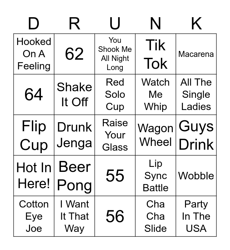 This bingo card has a free space and 58 words: Don't Stop Believin', I Want It That Way, Tipsy, Hot In Here!, Cha Cha Slide, Livin' On A Prayer, Shake It Off, Friends In Low Places, Watch Me Whip, Crank That, Tik Tok, Sweet Caroline, Teach Me How To Dougie, Jump On It, All The Small Things, Hooked On A Feeling, Party In The USA, Macarena, Gangnam Style, Red Solo Cup, Wagon Wheel, You Shook Me All Night Long, Cotton Eye Joe, Wobble, Cupid Shuffle, Guys Drink, Take A Drink, Ladies Drink, All The Single Ladies, Non Blonds Drink, Blonds Drink, Blue Eye folks Drink, Waterfall, Partners, If you feel old, DRINK, Selfie With A Stranger, Heads Up, Drunk Jenga, Flip Cup, Quarters, Beer Pong, Truth Or Truth, Lip Sync Battle, 51, 52, 53, 54, 55, 56, 57, 58, 59, 60, 61, 62, 63, 64 and 65.
