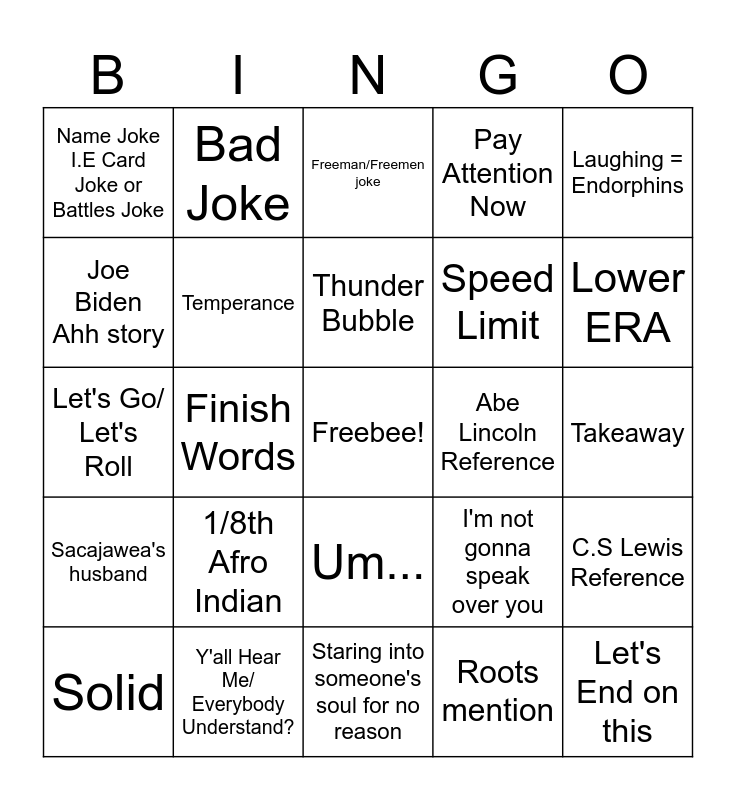This bingo card has a free space and 24 words: 1/8th Afro Indian, Y'all Hear Me/ Everybody Understand?, Thunder Bubble, Solid, Laughing = Endorphins, Name Joke I.E Card Joke or Battles Joke, Joe Biden Ahh story, Bad Joke, Abe Lincoln Reference, Um..., Speed Limit, Let's Go/ Let's Roll, I'm not gonna speak over you, C.S Lewis Reference, Temperance, Roots mention, Takeaway, Freeman/Freemen joke, Lower ERA, Finish Words, Let's End on this, Sacajawea's husband, Pay Attention Now and Staring into someone's soul for no reason.