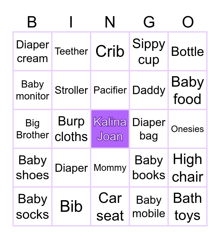 This bingo card has a free space and 25 words: Diaper, Car seat, Pacifier, Baby socks, Bottle, Diaper cream, Baby monitor, Teether, Diaper bag, Mommy, Daddy, Big Brother, Baby books, High chair, Stroller, Swing, Onesies, Crib, Baby food, Burp cloths, Bath toys, Bib, Baby shoes, Sippy cup and Baby mobile.