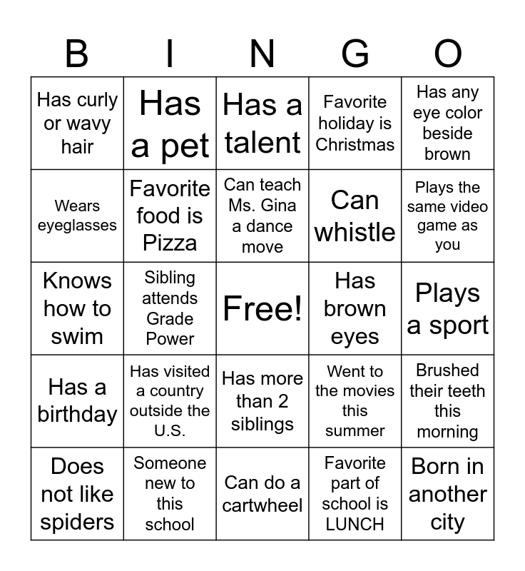 This bingo card has a free space and 24 words: Has visited a country outside the U.S., Someone new to this school, Can teach Ms. Gina a dance move, Does not like spiders, Has any eye color beside brown, Has curly or wavy hair, Wears eyeglasses, Has a pet, Has brown eyes, Has more than 2 siblings, Can whistle, Knows how to swim, Went to the movies this summer, Brushed their teeth this morning, Favorite food is Pizza, Favorite part of school is LUNCH, Plays a sport, Has a talent, Plays the same video game as you, Sibling attends Grade Power, Born in another city, Has a birthday, Favorite holiday is Christmas and Can do a cartwheel.