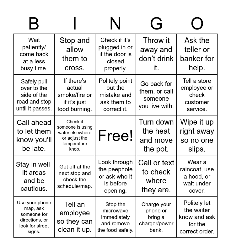 This bingo card has a free space and 24 words: Get off at the next stop and check the schedule/map., Tell an employee so they can clean it up., Politely point out the mistake and ask them to correct it., Use your phone map, ask someone for directions, or look for street signs., Ask the teller or banker for help., Wait patiently/ come back at a less busy time., Safely pull over to the side of the road and stop until it passes., Stop and allow them to cross., Turn down the heat and move the pot., Look through the peephole or ask who it is before opening., Go back for them, or call someone you live with., Call ahead to let them know you’ll be late., Call or text to check where they are., Wear a raincoat, use a hood, or wait under cover., If there’s actual smoke/fire or if it’s just food burning., Charge your phone or bring a charger/power bank., Wipe it up right away so no one slips., Check if it’s plugged in or if the door is closed properly., Tell a store employee or check customer service., Check if someone is using water elsewhere or adjust the temperature knob., Politely let the waiter know and ask for the correct order., Stay in well-lit areas and be cautious., Throw it away and don’t drink it. and Stop the microwave immediately and remove the food safely..