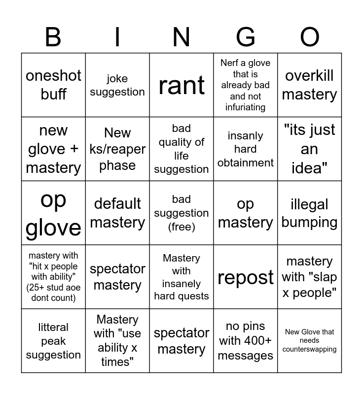 This bingo card has a free space and 24 words: spectator mastery, Mastery with "use ability x times", bad quality of life suggestion, litteral peak suggestion, overkill mastery, oneshot buff, new glove + mastery, joke suggestion, op mastery, Mastery with insanely hard quests, insanly hard obtainment, op glove, repost, mastery with "slap x people", New ks/reaper phase, no pins with 400+ messages, illegal bumping, rant, "its just an idea", default mastery, New Glove that needs counterswapping, mastery with "hit x people with ability" (25+ stud aoe dont count), Nerf a glove that is already bad and not infuriating and spectator mastery.