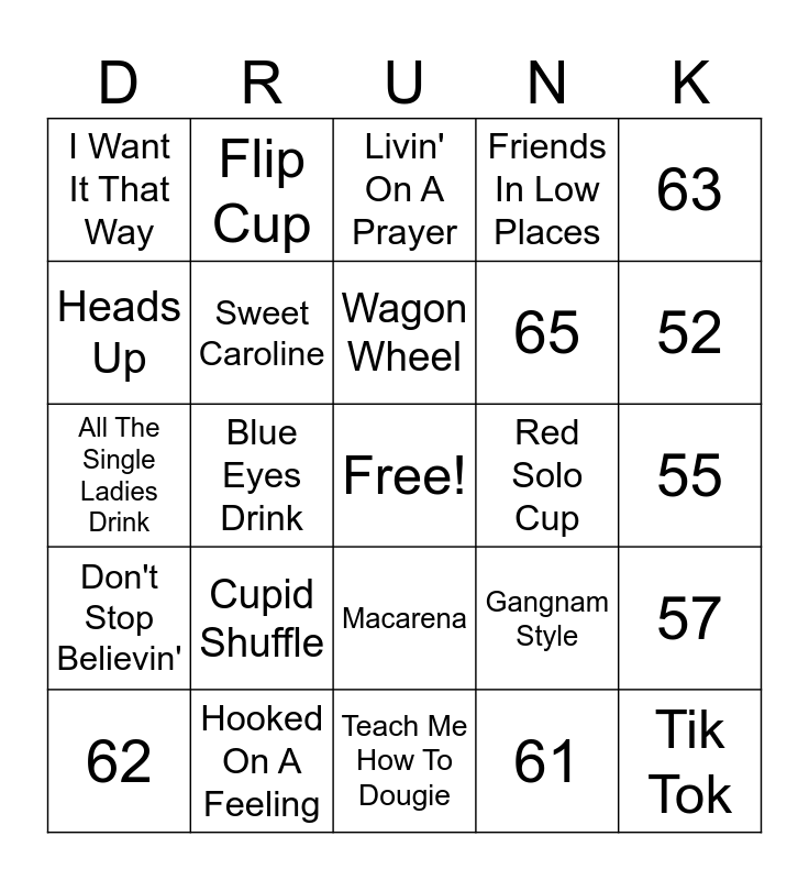 This bingo card has a free space and 58 words: Hot In Here!, Hooked On A Feeling, All The Small Things, Don't Stop Believin', 61, You Shook Me All Night Long, Sweet Caroline, Party In The USA, 65, 60, Friends In Low Places, Shake It Off, 64, 59, Tipsy, I Want It That Way, Tik Tok, 63, 58, Wagon Wheel, Red Solo Cup, Livin' On A Prayer, 62, 57, 56, 55, 54, 53, 52, 51, Guys Drink, Take A Drink, Waterfall, If you feel old, Drink, Partners, Blondes Drink, Non Blondes Drink, Blue Eyes Drink, All The Single Ladies Drink, Ladies Drink, Cupid Shuffle, Wobble, Gangnam Style, Jump On It, Crank That, Cha Cha Slide, Cotton Eye Joe, Macarena, Teach Me How To Dougie, Watch Me Whip, Lip Sync Battle, Truth Or Truth, Beer Pong, Quarters, Flip Cup, Drunk Jenga, Heads Up and Selfie With A Stranger.