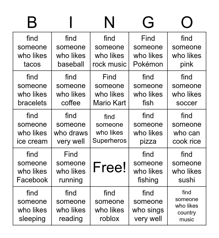 This bingo card has 35 words: Find someone who likes Basketball, Find someone who likes cats, find someone who likes Movies, find someone who likes fish, find someone who likes country music, find someone who likes tacos, find someone who likes coffee, find someone who likes traveling, find someone who likes pizza, find someone who likes video games, find someone who likes ice cream, find someone who likes baseball, Free!, find someone who likes swimming, find someone who likes pink, find someone who likes Facebook, find someone who likes reading, find someone who likes rock music, find someone who sings very well, find someone who can cook rice, find someone who likes sleeping, find someone who draws very well, find someone who likes Superheros, find someone who likes Spicy Foods, find someone who likes soccer, find someone who likes bracelets, find someone who likes their tablet, find someone who likes roblox, find someone who likes fishing, find someone who likes sushi, Find someone who plays an instrument, Find someone who likes running, Find someone who likes Mario Kart, Find someone who likes Pokémon and Find someone who can cook.