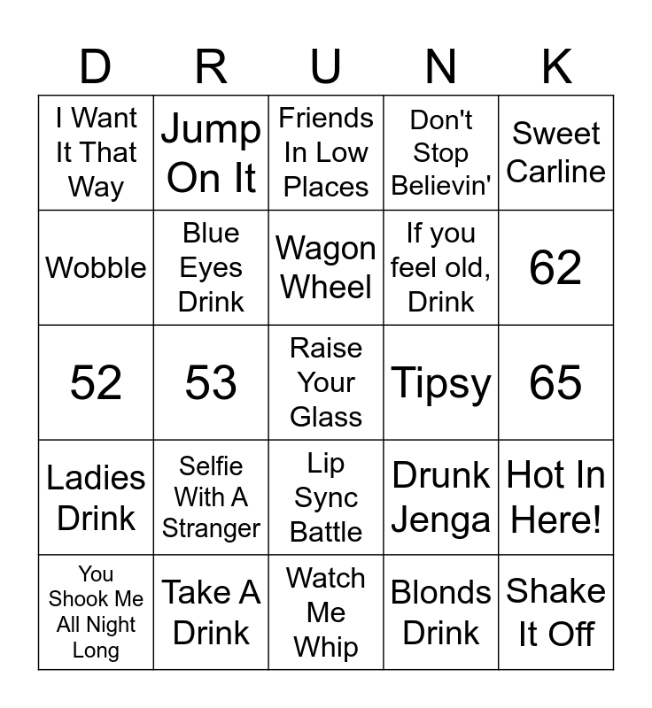 This bingo card has a free space and 58 words: Guys Drink, Take A Drink, All The Single Ladies Drink, Ladies Drink, Blonds Drink, Non Blonds Drink, Blue Eyes Drink, Waterfall, If you feel old, Drink, Partners, Don't Stop Believin', Livin' On A Prayer, Party In The USA, All The Small Things, Red Solo Cup, I Want It That Way, Shake It Off, Sweet Carline, Hooked On A Feeling, Wagon Wheel, Tipsy, Friends In Low Places, You Shook Me All Night Long, Hot In Here!, Tik Tok, 65, 64, 63, 62, 61, 60, 59, 58, 57, 56, 55, 54, 53, 52, 51, Selfie With A Stranger, Heads Up, Drunk Jenga, Flip Cup, Quarters, Beer Pong, Truth Or Truth, Lip Sync Battle, Watch Me Whip, Teach Me How To Dougie, Macarena, Cotton Eye Joe, Cha Cha Slide, Crank That, Jump On It, Gangnam Style, Wobble and Cupid Shuffle.
