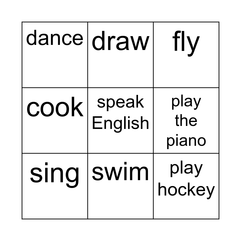 This bingo card has a free space and 8 words: play the piano, fly, draw, sing, dance, play hockey, cook and swim.