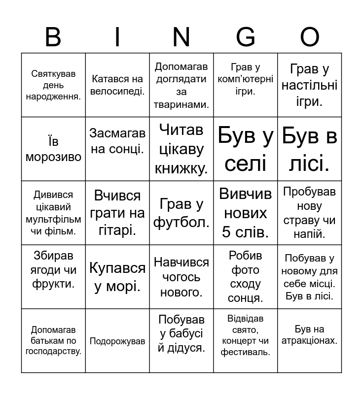 This bingo card has a free space and 24 words: Купався у морі., Подорожував, Читав цікаву книжку., Допомагав батькам по господарству., Грав у настільні ігри., Святкував день народження., Їв морозиво, Катався на велосипеді., Вивчив нових 5 слів., Навчився чогось нового., Був у селі, Дивився цікавий мультфільм чи фільм., Робив фото сходу сонця., Побував у новому для себе місці. Був в лісі., Засмагав на сонці., Відвідав свято, концерт чи фестиваль., Пробував нову страву чи напій., Допомагав доглядати за тваринами., Був в лісі., Вчився грати на гітарі., Був на атракціонах., Збирав ягоди чи фрукти., Грав у комп’ютерні ігри. and Побував у бабусі й дідуся..