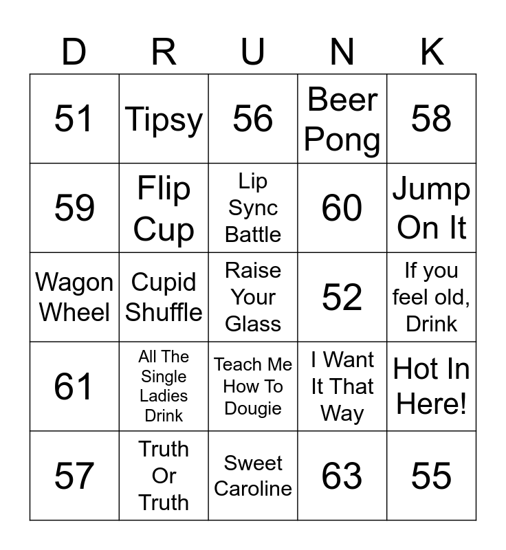 This bingo card has a free space and 59 words: Selfie With a Stranger, Truth Or Truth, 54, 61, 63, Heads Up, Flip Cup, 53, 60, 62, Beer Pong, Drunk Jenga, 59, 64, Quarters, 51, 55, 58, 65, Lip Sync Battle, 52, 56, 57, Hot In Here!, You Shook Me All Night Long, Livin' On A Prayer, Don't Stop Believin', Gangnam Style, Jump On It, Friends In Low Places, Tik Tok, Guys Drink, Wobble, Crank That, Tipsy, Party In The USA, Ladies Drink, Cupid Shuffle, Cha Cha Slide, Wagon Wheel, Red Solo Cup, All The Single Ladies Drink, If you feel old, Drink, Cotton Eye Joe, Hooked On A Feeling, All The Small Things, Take A Drink, Partner, Teach Me How To Dougie, Sweet Caroline, Red Solo Cup, Blonds Drink, Waterfall, Macarena, Shake It Off, I Want It That Way, Non Blonds Drink, Blue Eyes Drink and Watch Me Whip.