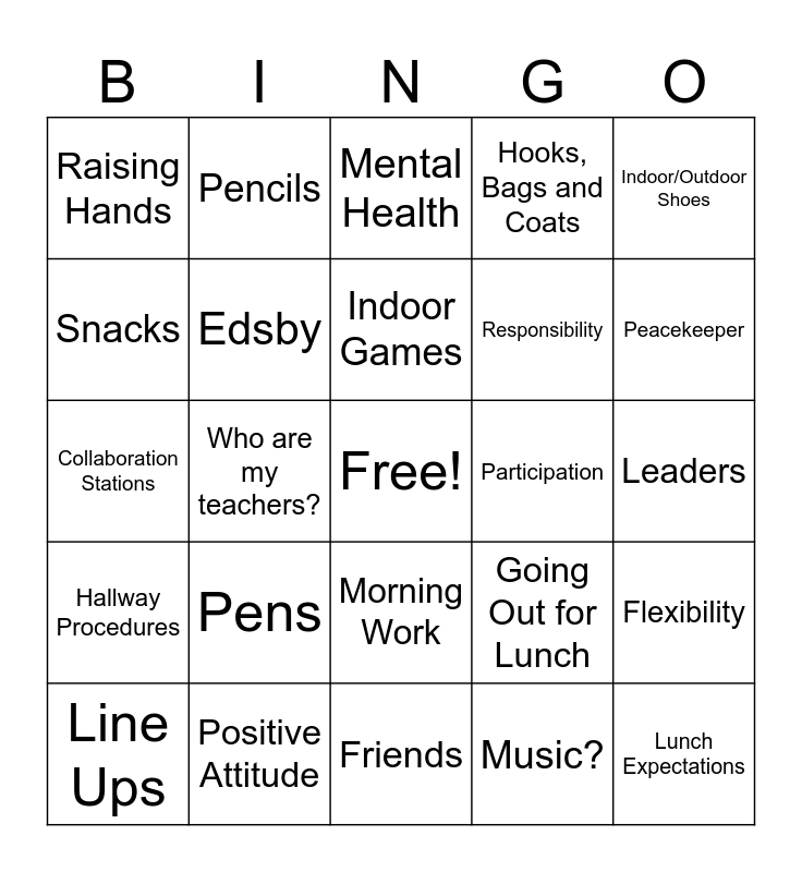 This bingo card has a free space and 35 words: Washrooms, Recess, Handing work in, Edsby, Morning Work, Hooks, Bags and Coats, Snacks, Hoods/Hats, Indoor Games, Teacher Only Areas, Collaboration Stations, Indoor/Outdoor Shoes, School Supplies, End of Day Routine, Raising Hands, Participation, Music?, Who are my teachers?, Hallway Procedures, Lunch Expectations, Going Out for Lunch, Line Ups, Flexibility, Positive Attitude, Mental Health, Peacekeeper, Growth Mindset, Independent, Responsibility, Leaders, Learning Skills, Friends, Pens, Pencils and Notes..