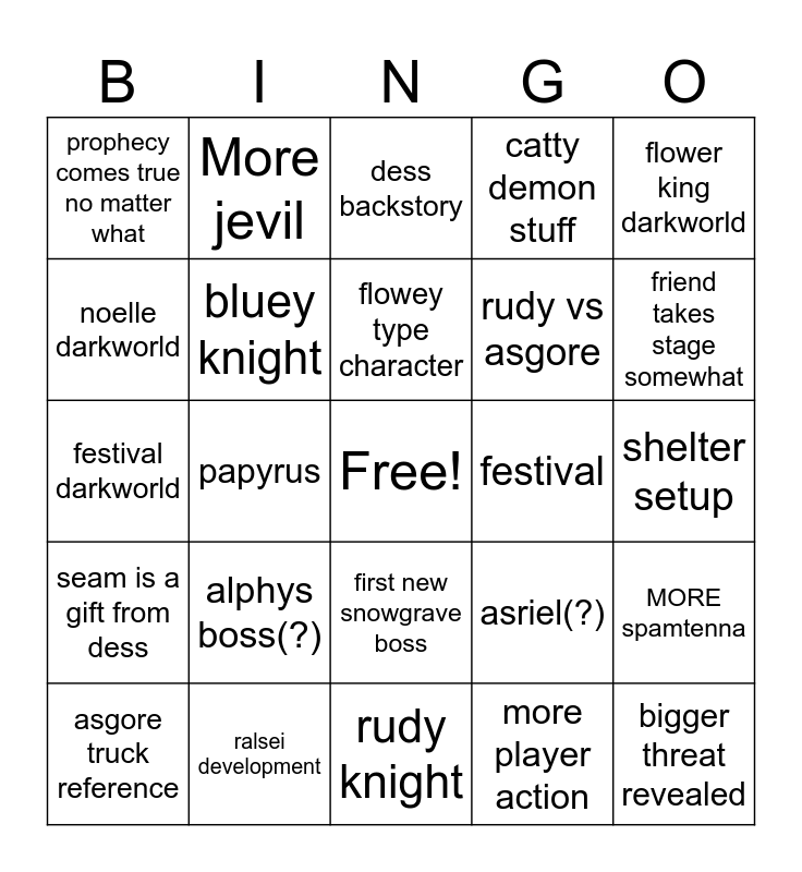 This bingo card has a free space and 24 words: alphys boss(?), ralsei development, flowey type character, asgore truck reference, flower king darkworld, prophecy comes true no matter what, noelle darkworld, More jevil, festival, first new snowgrave boss, rudy vs asgore, festival darkworld, asriel(?), MORE spamtenna, bluey knight, more player action, shelter setup, dess backstory, friend takes stage somewhat, papyrus, bigger threat revealed, seam is a gift from dess, catty demon stuff and rudy knight.