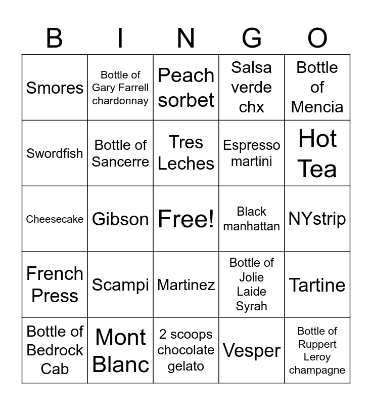 This bingo card has a free space and 24 words: Scampi, Mont Blanc, Tres Leches, Bottle of Bedrock Cab, Bottle of Mencia, Smores, Swordfish, Bottle of Gary Farrell chardonnay, Black manhattan, Martinez, Espresso martini, Cheesecake, Bottle of Jolie Laide Syrah, Tartine, Bottle of Sancerre, Vesper, NYstrip, Peach sorbet, Hot Tea, Gibson, Bottle of Ruppert Leroy champagne, French Press, Salsa verde chx and 2 scoops chocolate gelato.