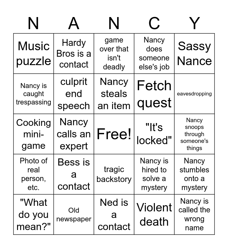 This bingo card has a free space and 50 words: Krolmeister, Nancy is called the wrong name, Sonny Joon, Ned is a contact, Bess is a contact, George is contact, Hardy Bros is a contact, Nancy's luggage, Nancy is caught trespassing, secret passage, culprit end speech, Nancy does someone else's job, Nancy stumbles onto a mystery, Nancy is hired to solve a mystery, reference to a past game, "hello." "goodbye." conversation, Nancy steals an item, "It's locked", Nancy is knocked out, Sassy Nance, Nancy calls an expert, Violent death, Music puzzle, Fetch quest, Koko Kringle, Nancy is seen on screen, eavesdropping, Puzzle that requires use of computer, game over that isn't deadly, tragic backstory, Dangerous animal, threatening note, Jump scare, Timed puzzle, Old newspaper, Secret compartment, Nancy mentions dead mom, Nancy is undercover, You learn an educational fact, Nancy snoops through someone's things, Nancy uses a mode of transportation that isn't walking, Money mechanic, Nancy gets a phone call, Nancy eats something, "What do you mean?", Cooking mini-game, Puzzle won randomly, Nancy finds treasure, Photo of real person, etc. and Nancy does a chore.