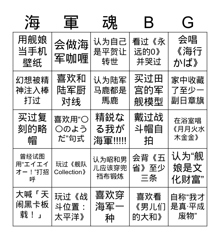 This bingo card has a free space and 24 words: 大喊「天闹黑卡板载!」, 玩过《舰队Collection》, 认为陆军马鹿都是馬鹿, 喜欢看《男儿们的大和》, 会唱《海行かば》, 用舰娘当手机壁纸, 会做海军咖喱, 认为自己是平贺让转世, 戴过战斗帽自拍, 在浴室唱《月月火水木金金》, 买过复刻的略帽, 喜欢和陆军厨对线, 会背《五省》至少三条, 认为“舰娘是文化财富”, 幻想被精神注入棒打过, 玩过《战斗位置:太平洋》, 喜欢穿海军一种, 看过《永远的0》并哭过, 家中收藏了至少一副日章旗, 曾经试图用“エイエイオー!”打招呼, 喜欢用“〇〇のようだ”句式, 认为昭和男儿应该穿兜裆布锻炼, 买过田宫的军舰模型 and 自称“我才是真·平成废物”.