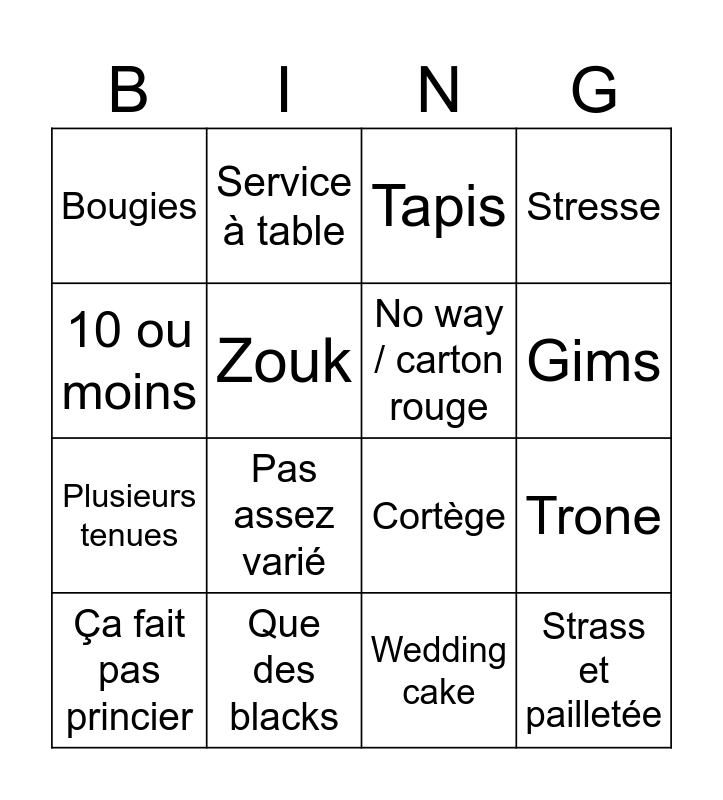 This bingo card has 16 words: Que des blacks, Trone, Tapis, Bougies, Plusieurs tenues, Service à table, Cortège, Wedding cake, 10 ou moins, Zouk, Ça fait pas princier, Stresse, Pas assez varié, Gims, No way / carton rouge and Strass et pailletée.