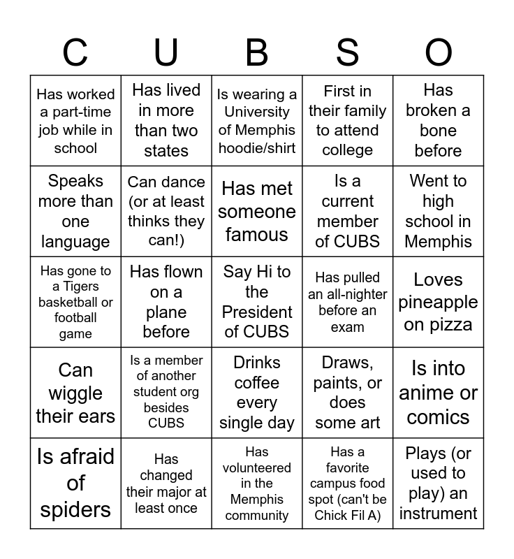 This bingo card has a free space and 24 words: Is a member of another student org besides CUBS, Has changed their major at least once, Has met someone famous, Is afraid of spiders, Has broken a bone before, Has worked a part-time job while in school, Speaks more than one language, Has lived in more than two states, Has pulled an all-nighter before an exam, Drinks coffee every single day, Is a current member of CUBS, Has gone to a Tigers basketball or football game, Draws, paints, or does some art, Is into anime or comics, Can dance (or at least thinks they can!), Has a favorite campus food spot (can't be Chick Fil A), Loves pineapple on pizza, Is wearing a University of Memphis hoodie/shirt, Went to high school in Memphis, Has flown on a plane before, Plays (or used to play) an instrument, Can wiggle their ears, First in their family to attend college and Has volunteered in the Memphis community.