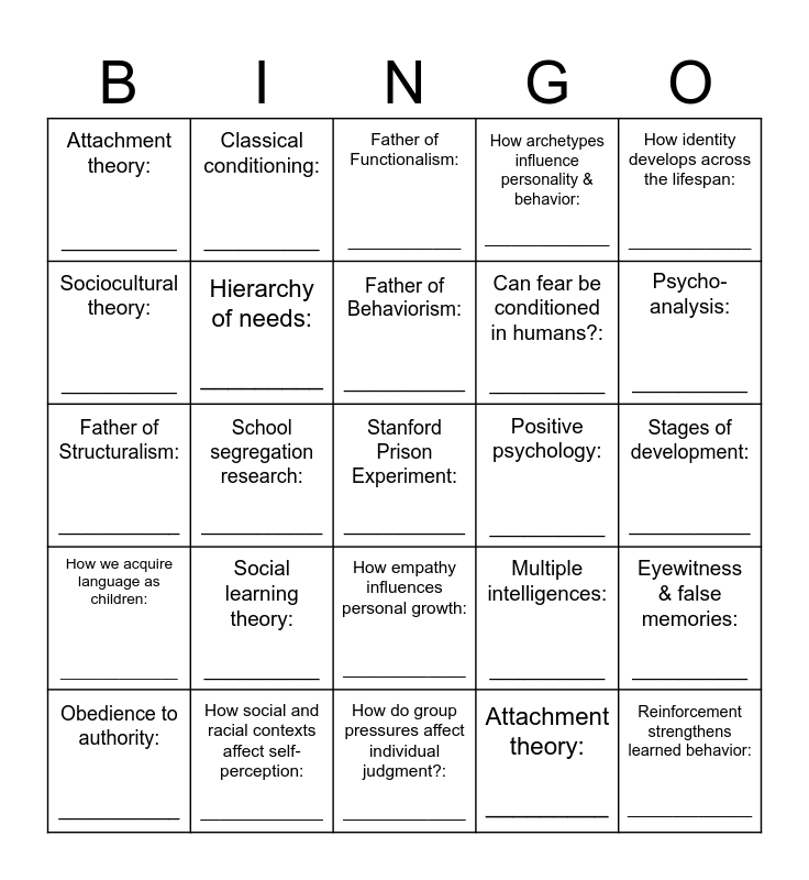 This bingo card has 25 words: Social learning theory: __________, How do group pressures affect individual judgment?: _____________, Father of Behaviorism: ___________, Obedience to authority: ___________, How identity develops across the lifespan: _____________, Attachment theory: __________, Sociocultural theory: __________, Classical conditioning: __________, Positive psychology: __________, How empathy influences personal growth: _____________, Can fear be conditioned in humans?: __________, Father of Structuralism: ___________, Multiple intelligences: __________, Eyewitness & false memories: __________, Hierarchy of needs: _________, Reinforcement strengthens learned behavior: ______________, Stages of development: ___________, Father of Functionalism: ____________, Psycho- analysis: __________, School segregation research: ___________, Stanford Prison Experiment: ___________, How social and racial contexts affect self-perception: _____________, How we acquire language as children: ______________, How archetypes influence personality & behavior: ______________ and Attachment theory: _________.