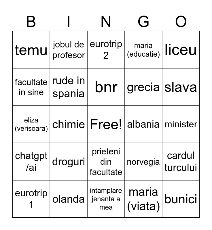 This bingo card has a free space and 24 words: droguri, olanda, bnr, eurotrip 1, liceu, temu, facultate in sine, jobul de profesor, albania, prieteni din facultate, grecia, eliza (verisoara), norvegia, cardul turcului, rude in spania, maria (viata), minister, eurotrip 2, slava, chimie, bunici, chatgpt /ai, maria (educatie) and intamplare jenanta a mea.