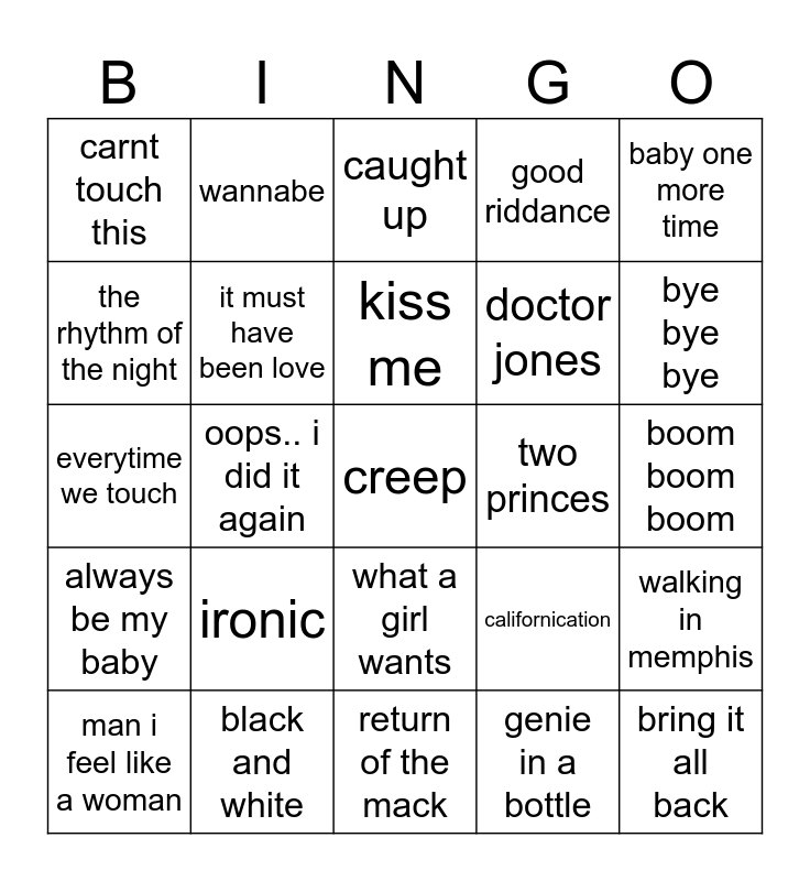 This bingo card has 50 words: gangsta's paradise, creep, everything i do i do it for you, return of the mack, ironic, barbie girl, wannabe, wonderwall, the rhythm of the night, girls and boys, it must have been love, good riddance, walking in memphis, californication, i'll be there for you, mmmbop, kiss me, two princes, believe, baby one more time, oops.. i did it again, genie in a bottle, carnt touch this, doctor jones, ice ice baby, bring it all back, bye bye bye, say my name, caught up, what a girl wants, blue, flying without wings, all the small things, no diggity, black and white, no scrubs, mysterious girl, cotton eye joe, c'est la vie, boom boom boom, take my breath away, thunderstruck, men in black, witch doctor, man i feel like a woman, everytime we touch, id do anything for love, lovefool, always be my baby and i want it that way.