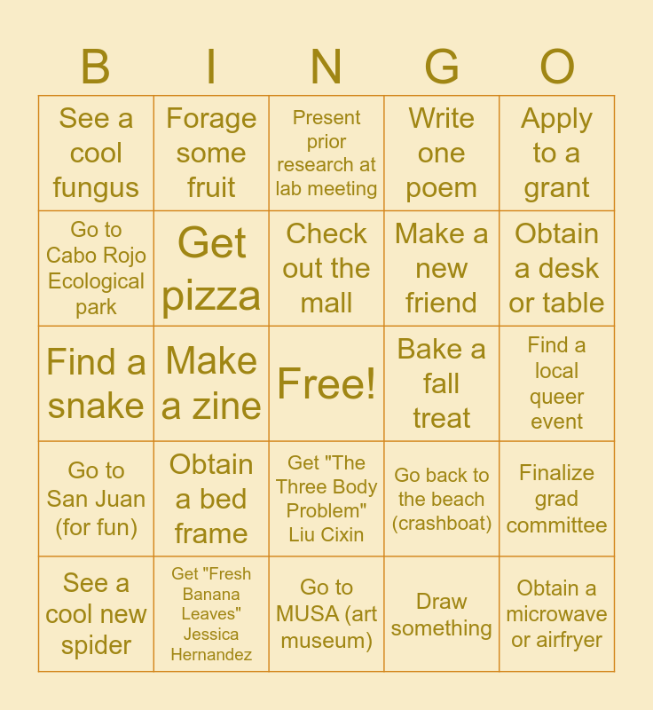 This bingo card has a free space and 24 words: Obtain a bed frame, Get "Fresh Banana Leaves" Jessica Hernandez, Check out the mall, See a cool new spider, Apply to a grant, See a cool fungus, Go to Cabo Rojo Ecological park, Forage some fruit, Bake a fall treat, Get "The Three Body Problem" Liu Cixin, Make a new friend, Find a snake, Go back to the beach (crashboat), Finalize grad committee, Get pizza, Draw something, Find a local queer event, Present prior research at lab meeting, Obtain a desk or table, Make a zine, Obtain a microwave or airfryer, Go to San Juan (for fun), Write one poem and Go to MUSA (art museum).