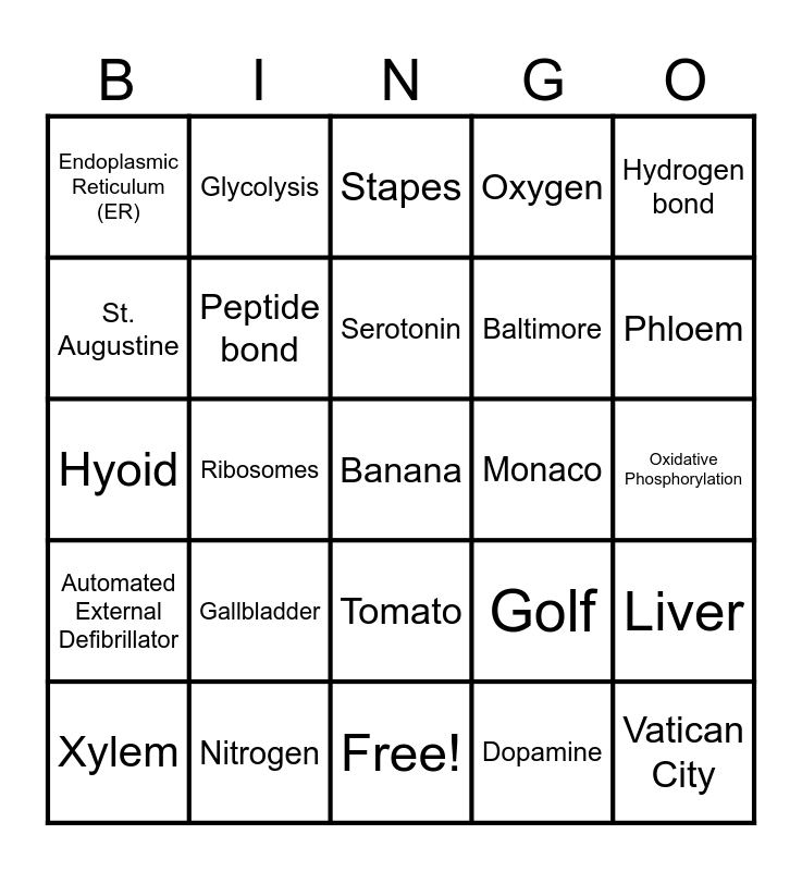 This bingo card has 25 words: Automated External Defibrillator, Nitrogen, Banana, Dopamine, Hydrogen bond, Endoplasmic Reticulum (ER), Glycolysis, Stapes, Monaco, Liver, St. Augustine, Peptide bond, Free!, Golf, Phloem, Xylem, Ribosomes, Serotonin, Baltimore, Oxidative Phosphorylation, Hyoid, Gallbladder, Tomato, Oxygen and Vatican City.
