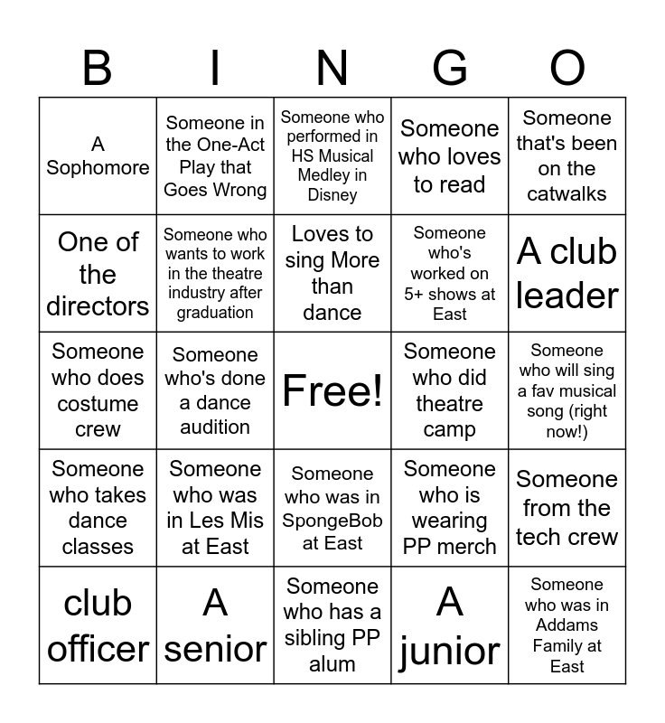 This bingo card has a free space and 24 words: Someone who was in Les Mis at East, A senior, Loves to sing More than dance, club officer, Someone that's been on the catwalks, A Sophomore, One of the directors, Someone in the One-Act Play that Goes Wrong, Someone who did theatre camp, Someone who was in SpongeBob at East, Someone who's worked on 5+ shows at East, Someone who does costume crew, Someone who is wearing PP merch, Someone from the tech crew, Someone who wants to work in the theatre industry after graduation, A junior, Someone who will sing a fav musical song (right now!), Someone who performed in HS Musical Medley in Disney, A club leader, Someone who's done a dance audition, Someone who was in Addams Family at East, Someone who takes dance classes, Someone who loves to read and Someone who has a sibling PP alum.