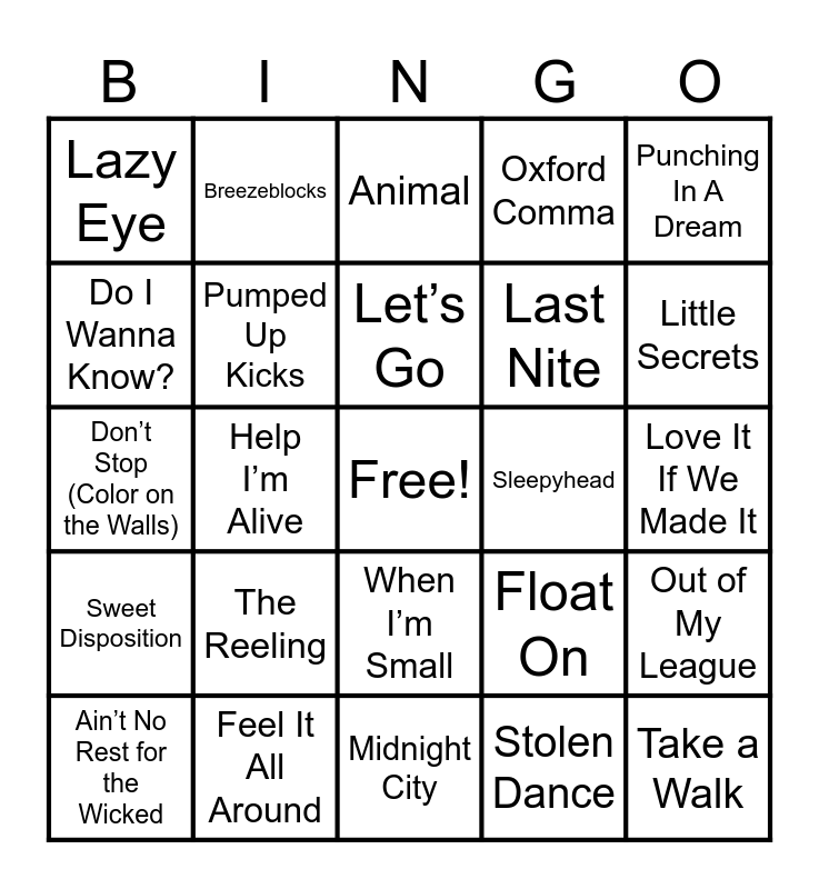 This bingo card has a free space and 50 words: Tongue Tied, Take a Walk, Young Blood, Midnight City, The Reeling, The Less I Know The Better, Breezeblocks, Royals, Do I Wanna Know?, Kids, Pumped Up Kicks, Oxford Comma, Out of My League, Float On, When You Were Young, Maps, Let’s Go, Sleepyhead, Polish Girl, Punching In A Dream, Help I’m Alive, Stolen Dance, Lazy Eye, Last Nite, I Wanna Get Better, Shut Up and Dance, Little Secrets, ‘Cause I’m A Man, Animal, When I’m Small, Title and Registration, Such Great Heights, Mr. Brightside, Not Alone, Feel It All Around, Hide and Seek, People Say, Florida, Cosmic Love, Love It If We Made It, It’s Not My Fault, I’m Happy, To Kingdom Come, The Walker, Lonely Boy, Ain’t No Rest for the Wicked, Don’t Stop (Color on the Walls), Closer, Unbelievers, Sweet Disposition and Little Talks.