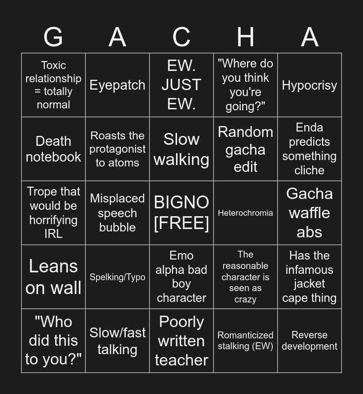 This bingo card has a free space and 24 words: Spelking/Typo, Slow/fast talking, Slow walking, "Who did this to you?", Hypocrisy, Toxic relationship = totally normal, Death notebook, Eyepatch, Heterochromia, Emo alpha bad boy character, Random gacha edit, Trope that would be horrifying IRL, The reasonable character is seen as crazy, Has the infamous jacket cape thing, Roasts the protagonist to atoms, Romanticized stalking (EW), Gacha waffle abs, EW. JUST EW., Enda predicts something cliche, Misplaced speech bubble, Reverse development, Leans on wall, "Where do you think you're going?" and Poorly written teacher.