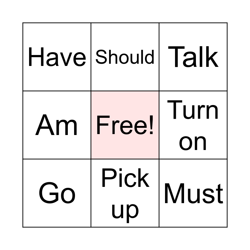 This bingo card has a free space and 8 words: Turn on, Talk, Should, Go, Have, Must, Am and Pick up.